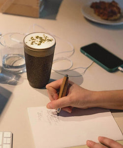 De premium versie van de populaire Weducer Cup is iets groter van formaat, dubbelwandig, en prachtig verfijnd. De donkere buitenlaag is gemaakt van gerecycled koffiedik, de kleurrijke binnenlaag en het drinkdeksel zijn gemaakt van een innovatieve materiaalsamenstelling op basis van gerecyclede beukenhoutvezels.