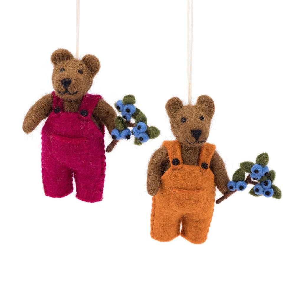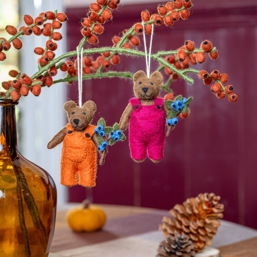 Vilten berenhanger. Vrolijke beer met een trosje blauwe bessen in de hand en een tuinpak in warme cognac kleur. Een vrolijke toevoeging aan tak, slinger of herfstdecoratie. Eenvoudig op te hangen met een touwtje.