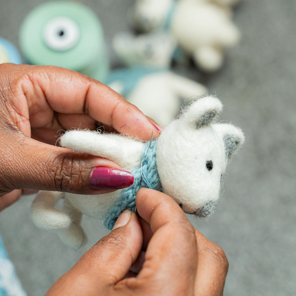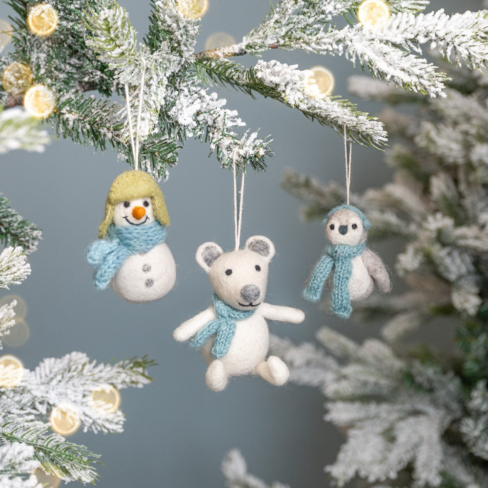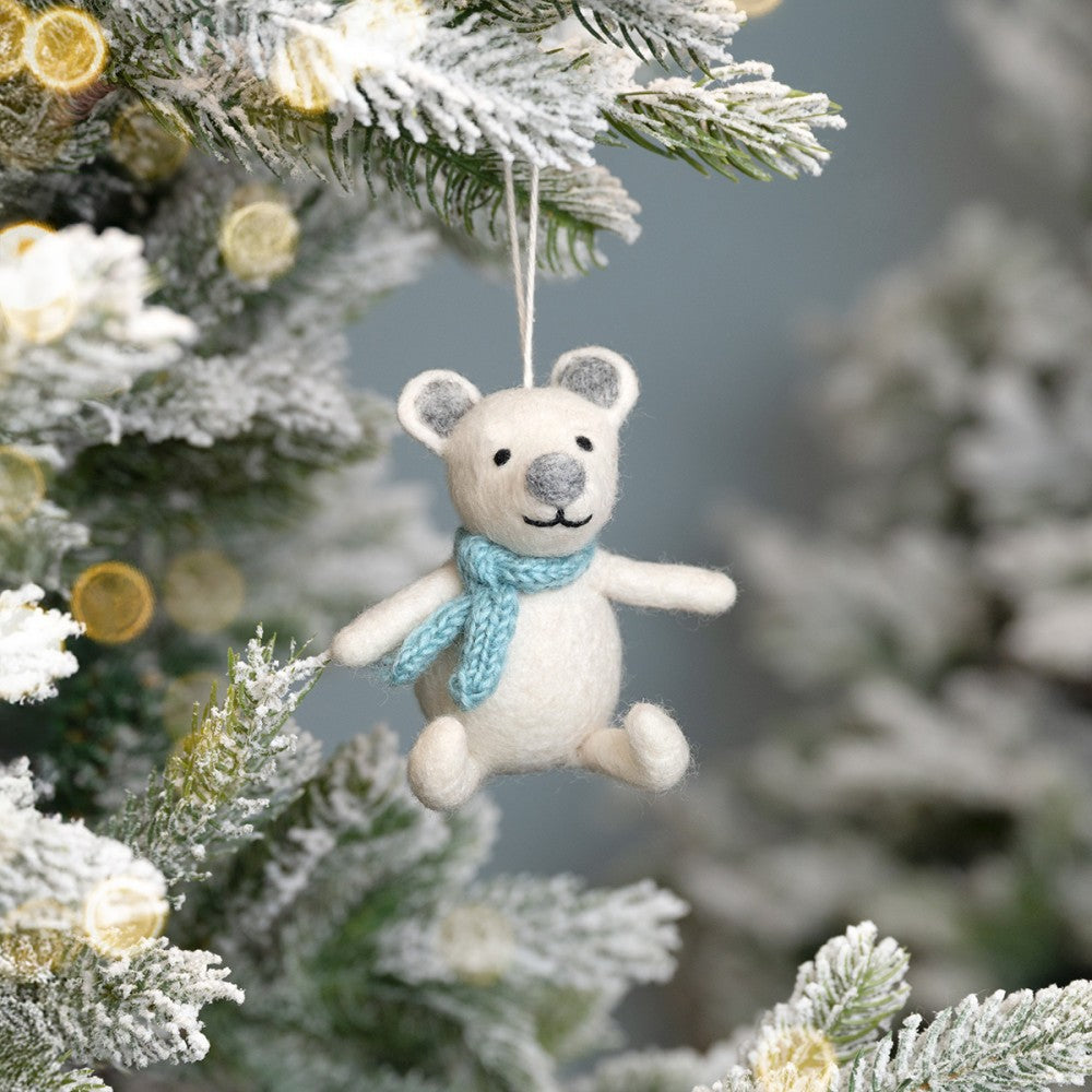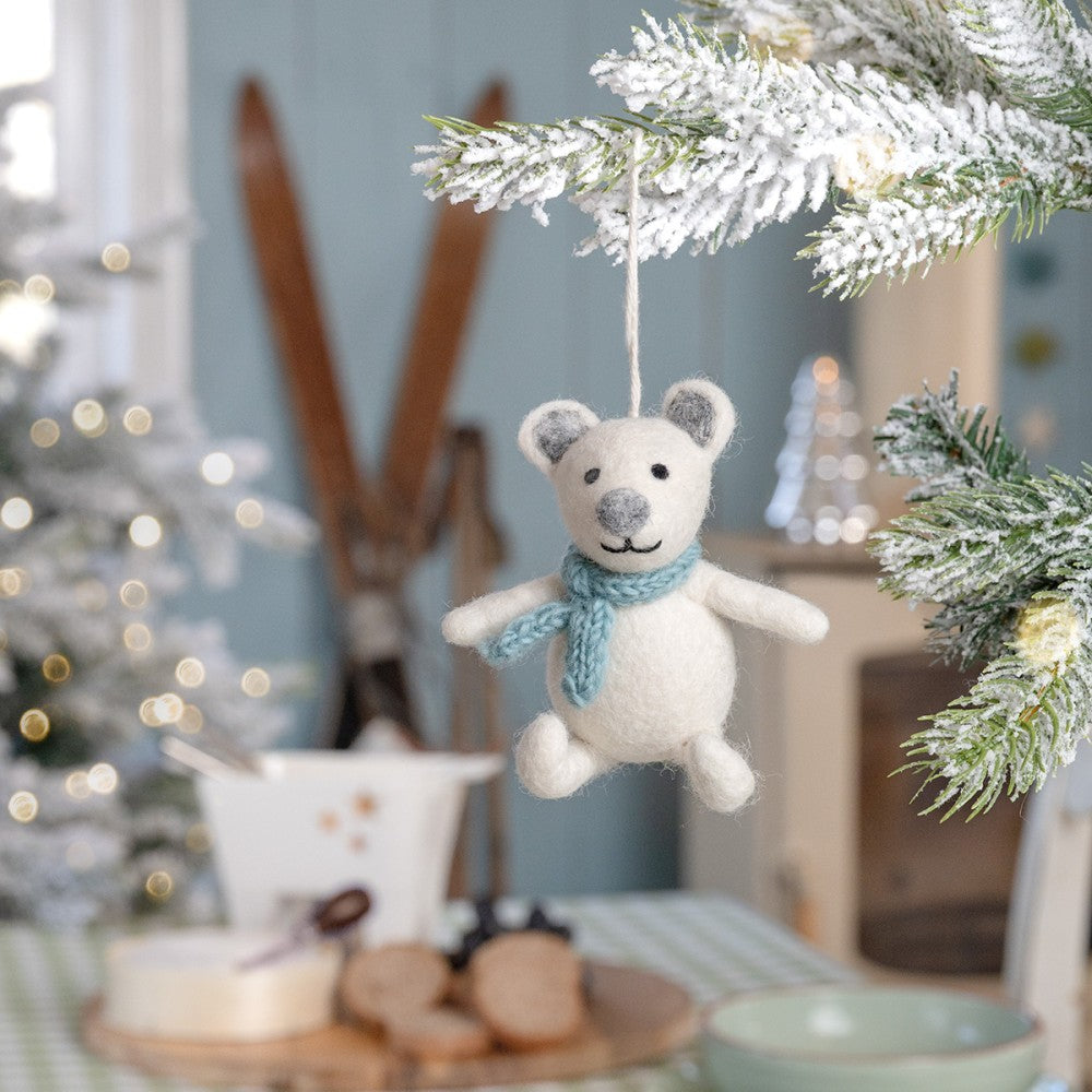 Een vilten hanger van een ijsbeer met een zachte ijsblauwe sjaal. Een winterse decoratie die een knus accent geeft aan de kerstboom of een seizoenshoekje in huis.