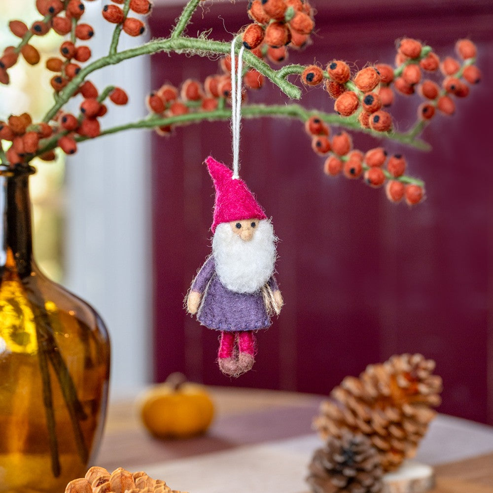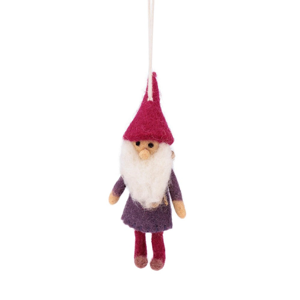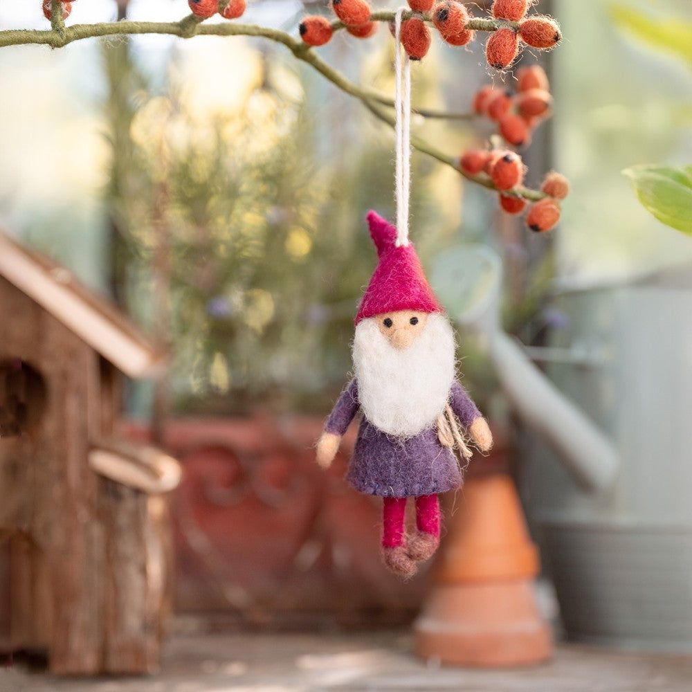 Deze vilten kabouter draagt een paars jasje met een burgundy puntmuts. Perfect voor wie houdt van rijke kleuren en een warme, gezellige sfeer. Leuk aan een herfsttak of wintertak.