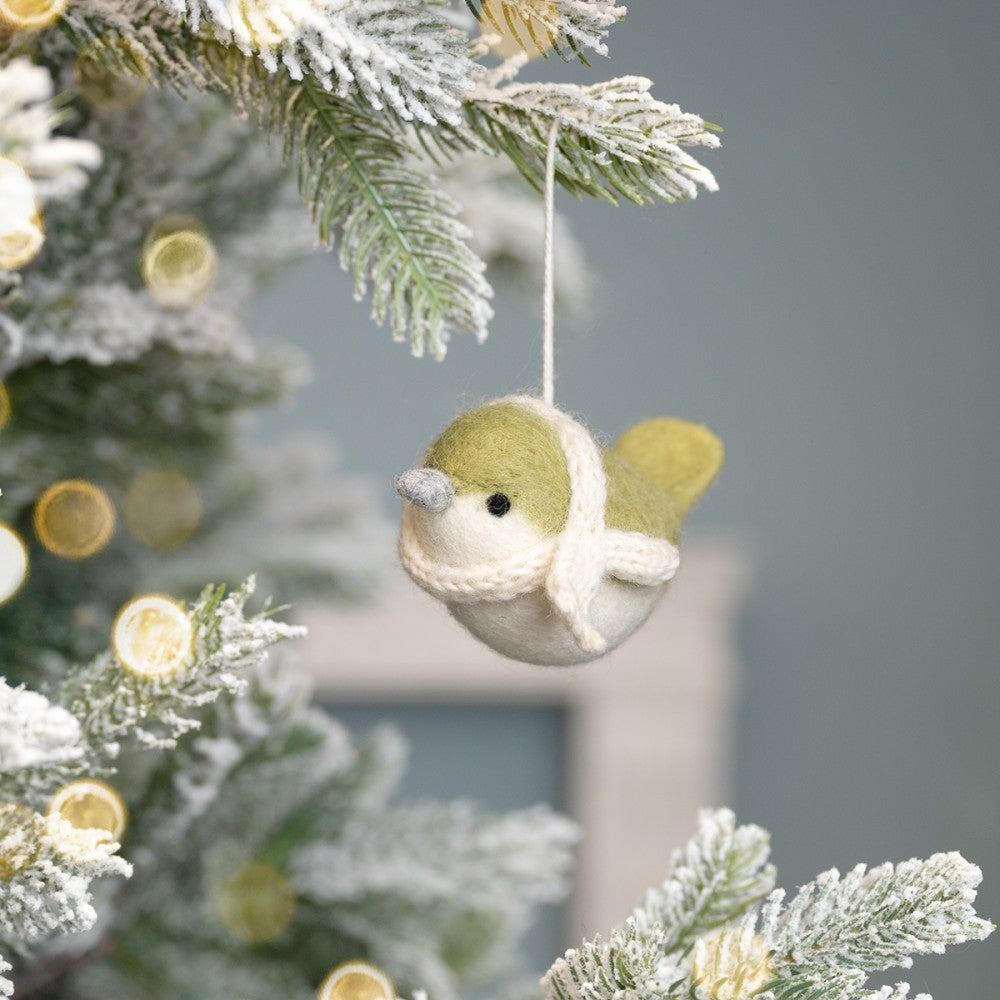 Een sfeervolle hanger in de vorm van een lichtgroen vogeltje, met de hand gevilt en voorzien van een gebreide sjaal. De frisse groentinten en zachte textuur geven dit vogeltje een natuurlijke uitstraling, perfect voor een kerstboom of een subtiele seizoensdecoratie. Een bijzondere blikvanger die mooi samengaat met andere vilten ornamenten voor een uitgebalanceerd geheel.