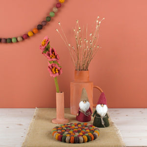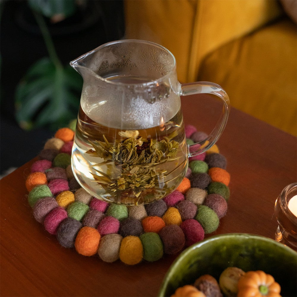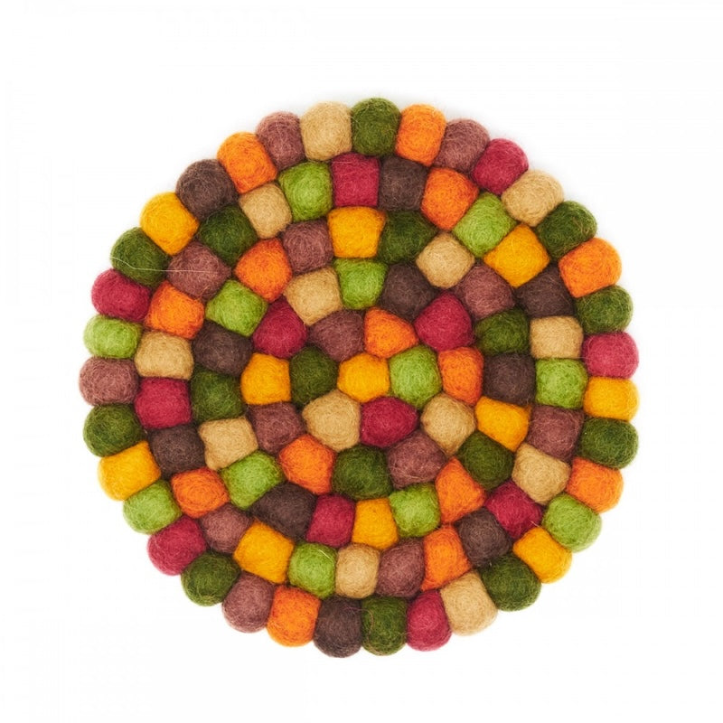 Deze vrolijke onderzetter is gemaakt van verschillende kleuren vilten balletjes in aardetinten. De doorsnede is 20 cm. Staat bijvoorbeeld erg leuk met een vaas bloemen erop!