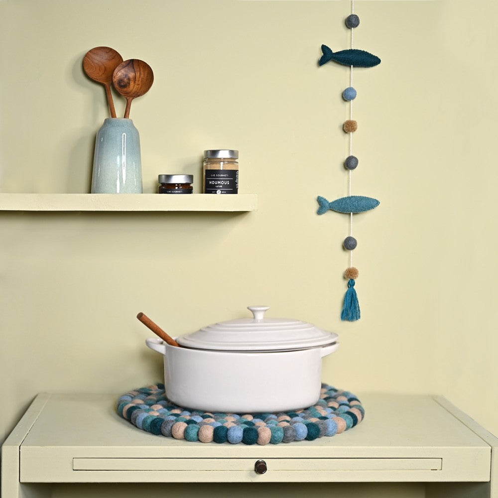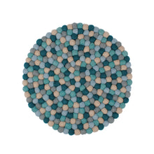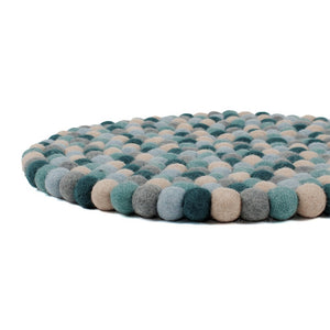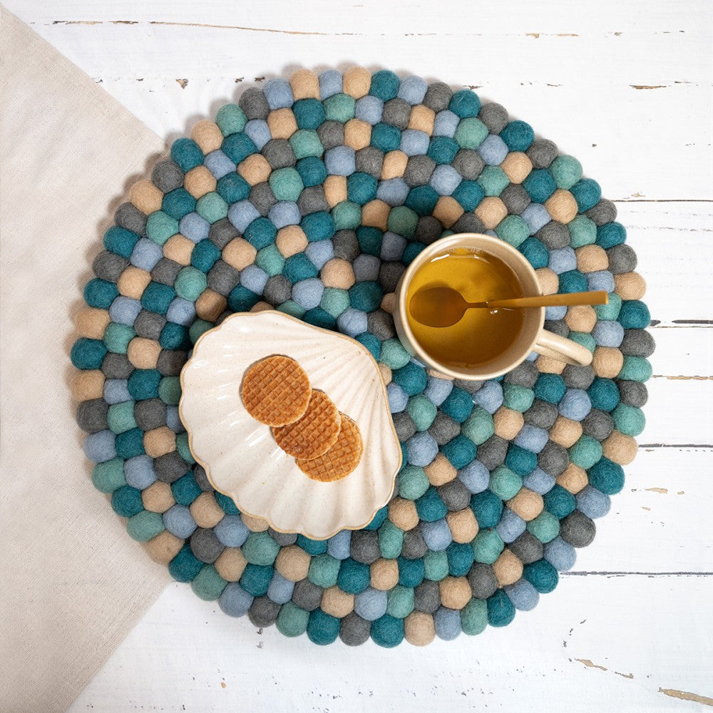 Deze vrolijke onderzetter is gemaakt van verschillende kleuren vilten balletjes in blauwtinten. De doorsnede is 40 cm. Wordt ook veel gebruikt als zitting op een stoel. Staat ook erg leuk met een vaas bloemen erop of als kleedje onder een bijzettafeltje!