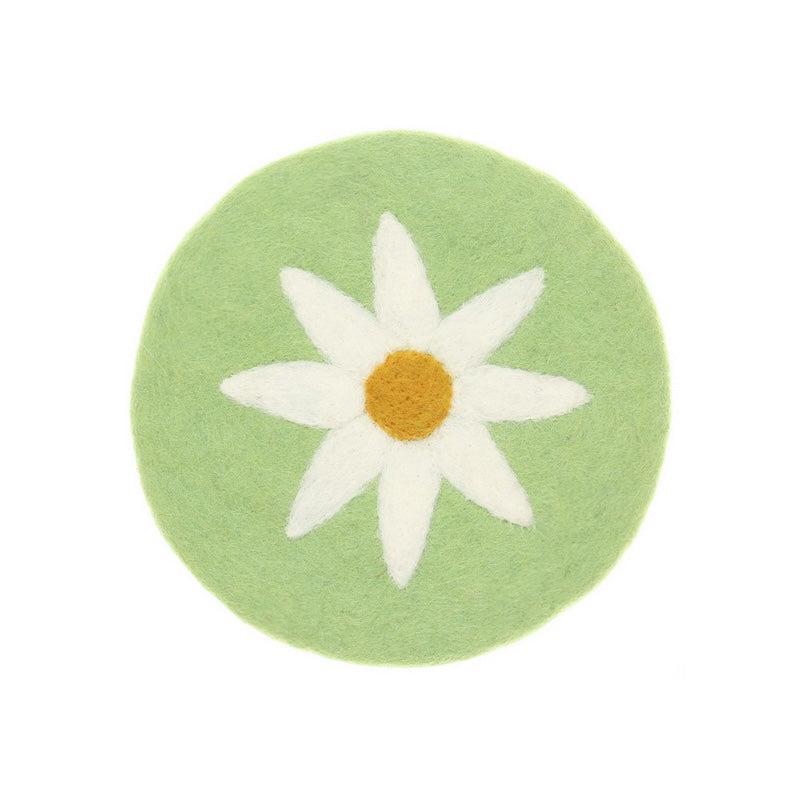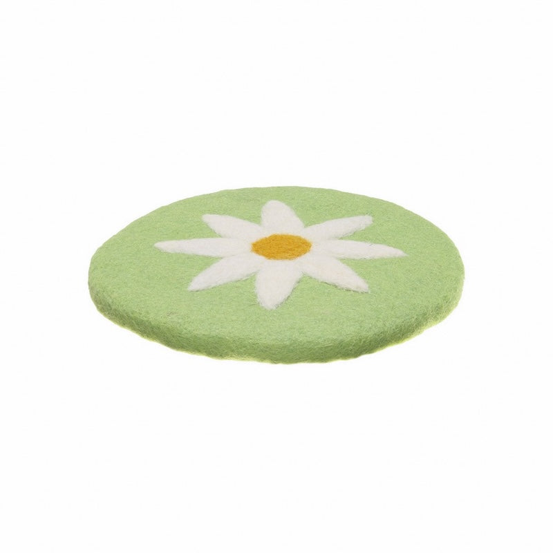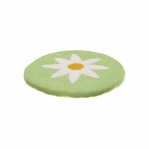 Vilten onderzetter in de kleur groen met een margrietje erop gevilt. De doorsnee is ca. 20 cm en de dikte 0,5 cm. Verkrijgbaar in 6 kleuren.