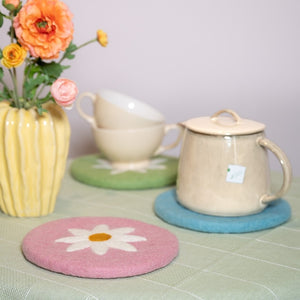 Vilten onderzetter in de kleur roze met een margrietje erop gevilt. De doorsnee is ca. 20 cm en de dikte 0,5 cm. Verkrijgbaar in 6 kleuren.