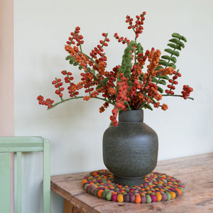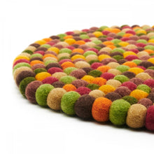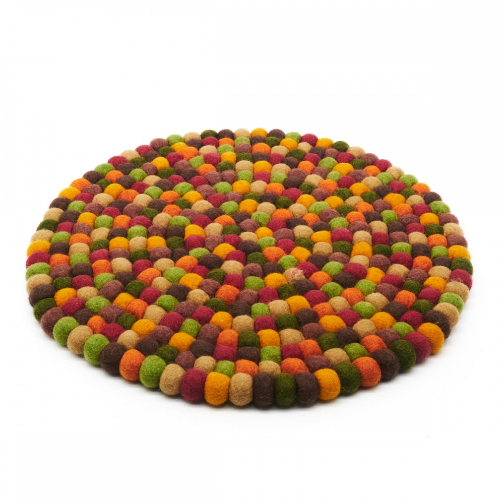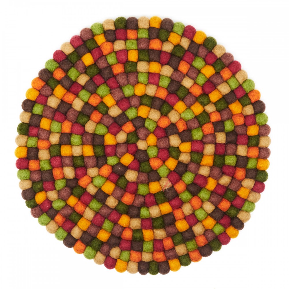 Deze vrolijke onderzetter is gemaakt van verschillende kleuren vilten balletjes in aardetinten. De doorsnede is 40 cm. Wordt ook veel gebruikt als zitting op een stoel. Staat ook erg leuk met een vaas bloemen erop of als kleedje onder een bijzettafeltje!