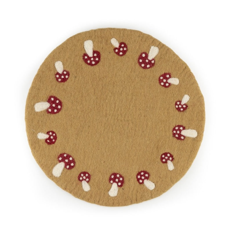 Vilten onderzetter in de kleur beige met een krans van paddenstoelen erop. Erg leuk om je herfsttafel mee te dekken.
