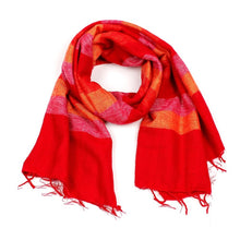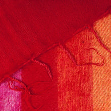Heerlijke zachte sjaal in de kleuren fuchsia, rood en oranje. Omdat de sjaal geborsteld is, voelt hij lekker zacht aan. In de winter te dragen als warme sjaal en in de zomer als omslagdoek.