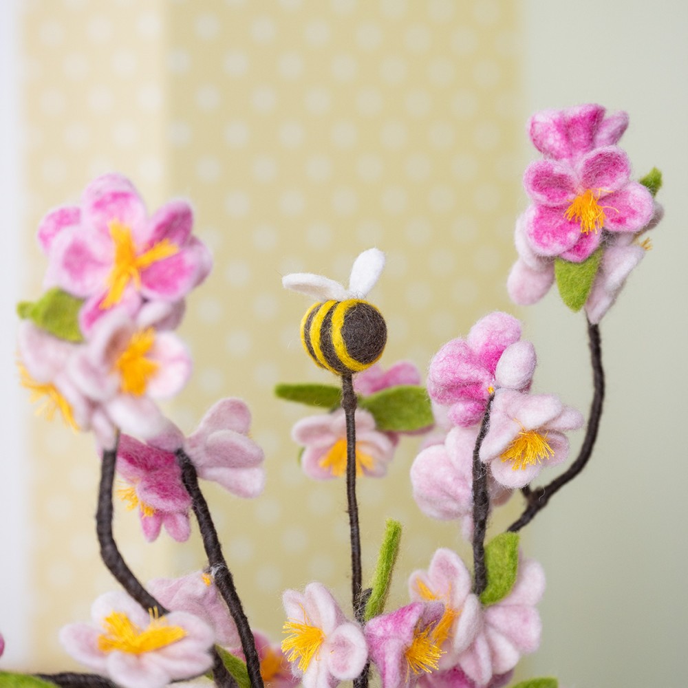 Een steker van een vilten bijtje. De steker is van metaaldraad omwikkeld met vilt, en kan in ieder gewenste vorm worden gebogen. Leuk in een vilten boeket (kijk ook eens bij onze bloemen).