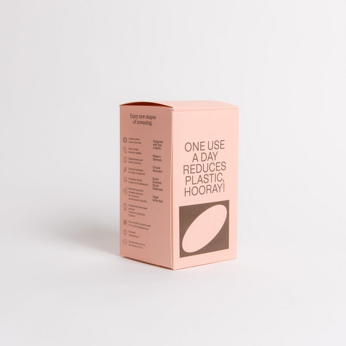The premium version of the popular Weducer Cup is slightly larger in size, double-walled, and beautifully refined. The dark outer layer is made from recycled coffee grounds, the colorful inner layer and drinking lid are made from an innovative material composition based on recycled beech wood fibers.
