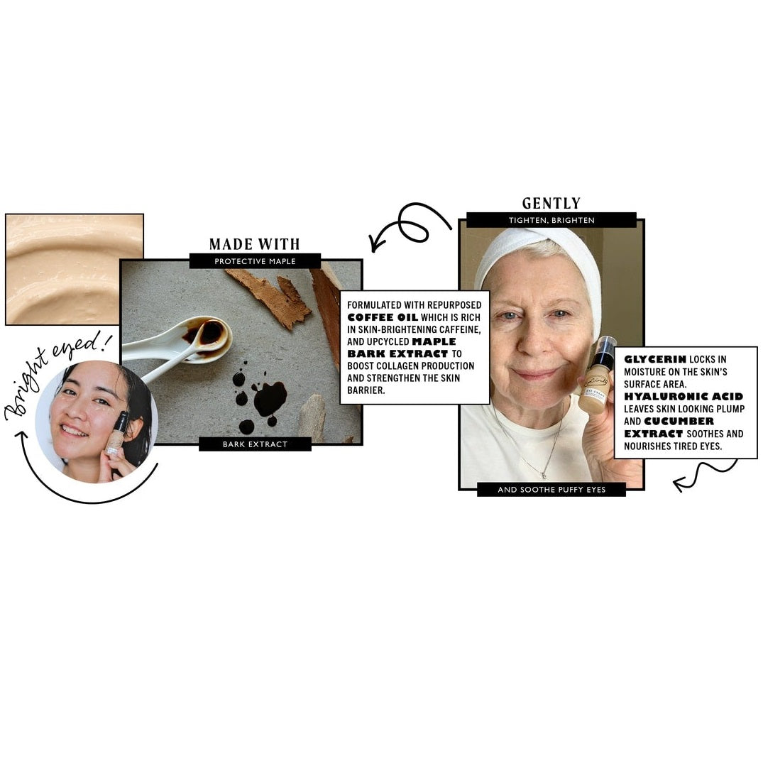 Circulair ingrdiënt: Deze oogcrème is gemaakt met koffieolie gewonnen uit hergebruikte gronden, en ontstekingsremmend extract van esdoornschors, een bijproduct van de houtindustrie.