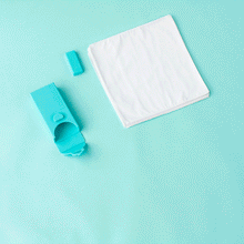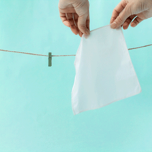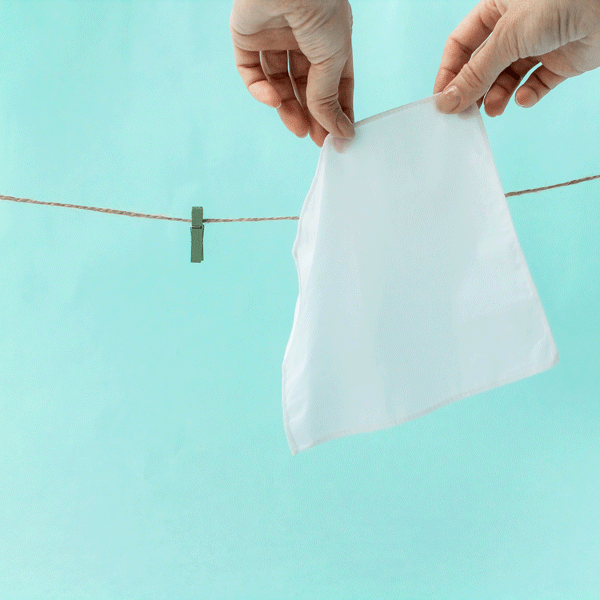Gebruik: Neem een zakdoekje uit de bodem van het hoesje, gebruik het zakdoekje, en plaats het zakdoekje dan weer bovenin het hoesje. Op deze manier duw je de schone zakdoekjes naar beneden, waardoor ze klaar zijn voor gebruik en gescheiden worden van de gebruikte. Je weet dat je aan je laatste zakdoekje toe bent wanneer het gemarkeerde zakdoekje verschijnt - dat betekent dat het tijd is om de doekjes te wassen. Na het wassen, pak je ze opnieuw in en gebruik je ze opnieuw.