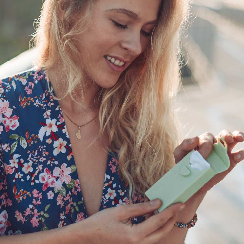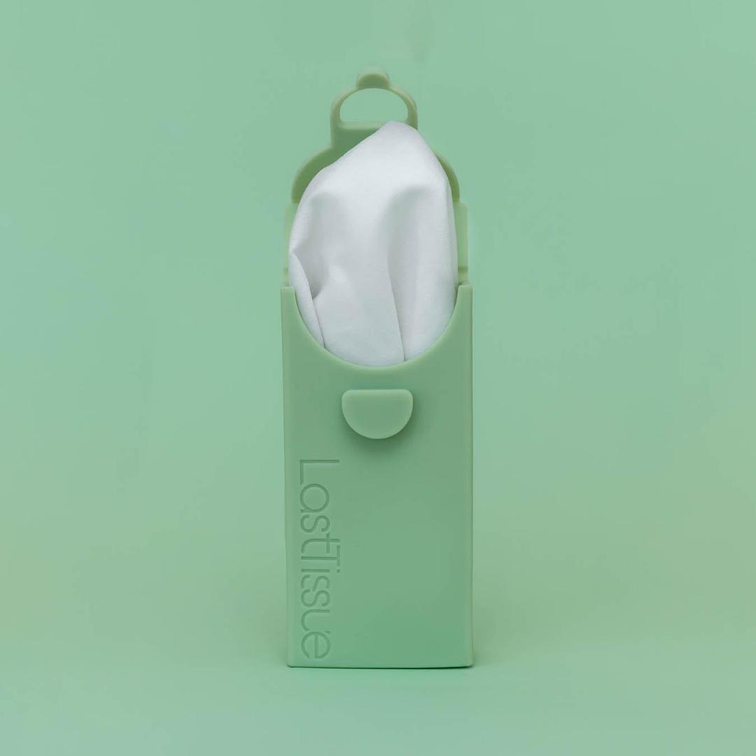 LastTissue bevat 6 biologisch katoenen zakdoekjes in een handig siliconen hoesje.