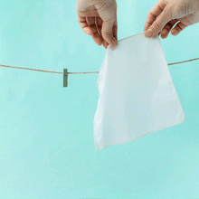 Gebruik: Neem een zakdoekje uit de bodem van het hoesje, gebruik het zakdoekje, en plaats het zakdoekje dan weer bovenin het hoesje. Op deze manier duw je de schone zakdoekjes naar beneden, waardoor ze klaar zijn voor gebruik en gescheiden worden van de gebruikte. Je weet dat je aan je laatste zakdoekje toe bent wanneer het gemarkeerde zakdoekje verschijnt - dat betekent dat het tijd is om de doekjes te wassen. Na het wassen, pak je ze opnieuw in en gebruik je ze opnieuw.