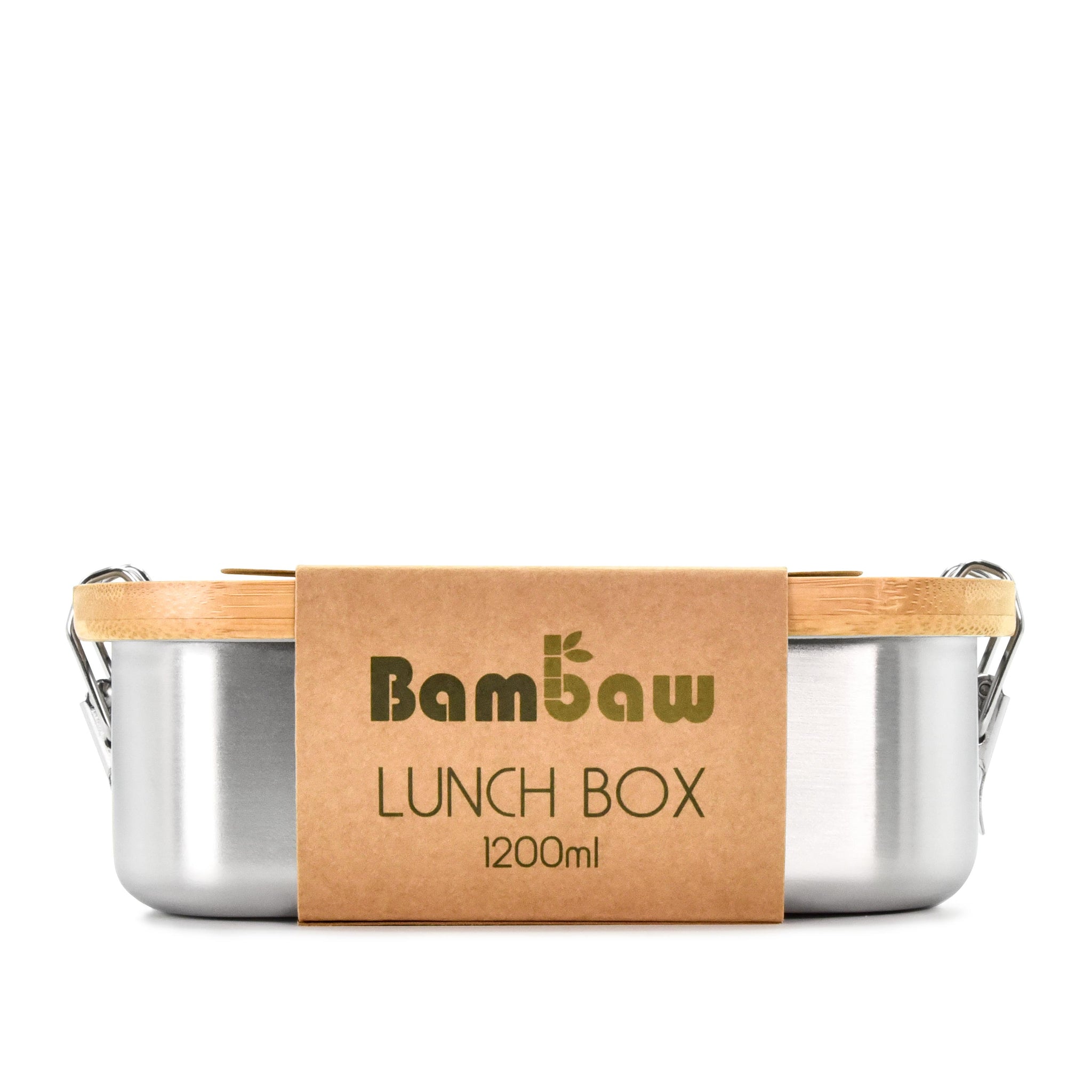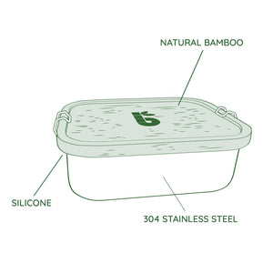 De lunchbox is moeiteloos schoon te maken dankzij de afgeronde hoeken en kan in de vaatwasser - zonder deksel - en is volledig lekvrij dankzij de verwijderbare BPA-vrije siliconen ring. Hoewel hij niet magnetronbestendig is, kan hij wel in de oven of boven een kampvuur als het deksel verwijderd is. Het deksel van natuurlijk bamboe kan ook worden gebruikt als handige snijplank.