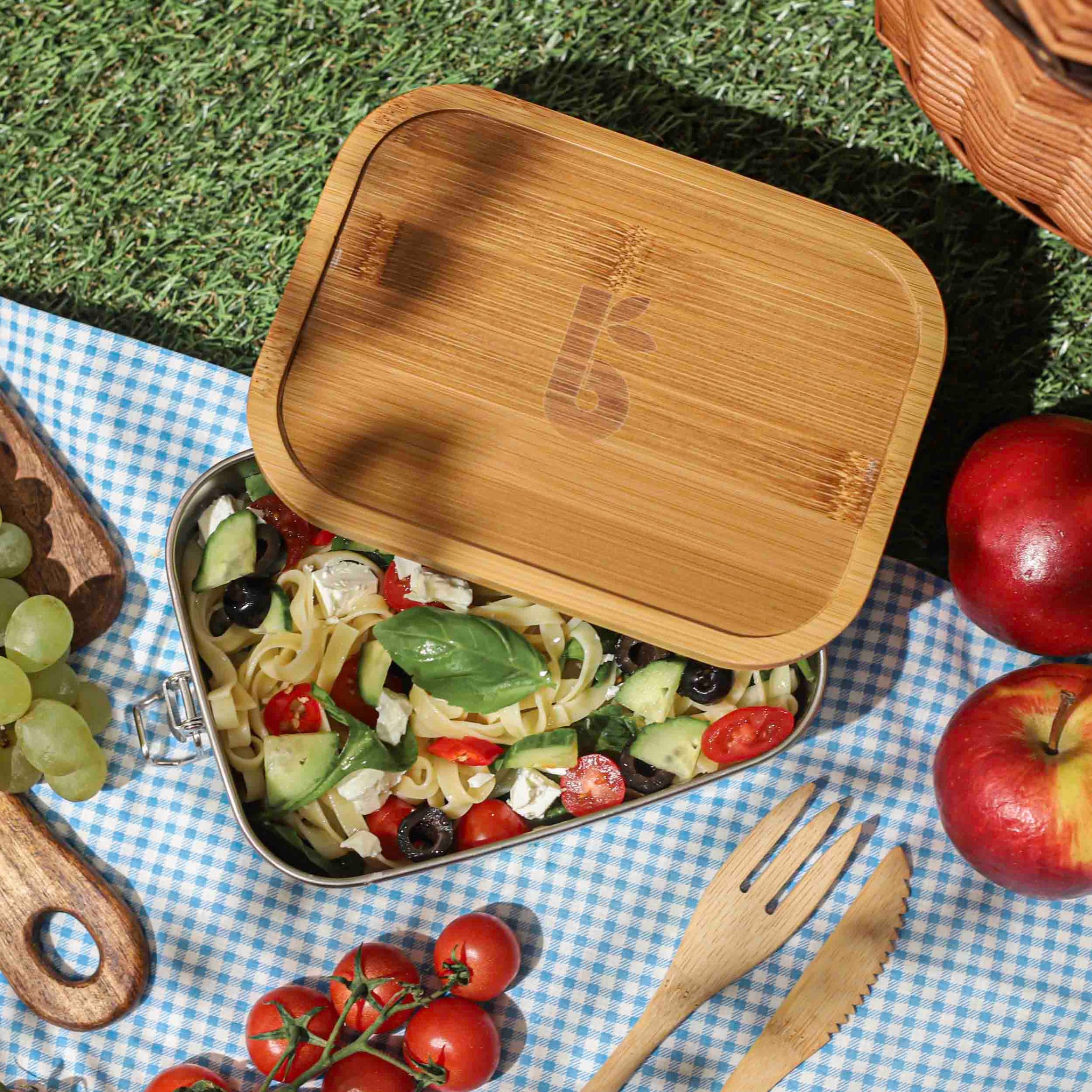 De roestvrijstalen lunchbox is de slimme oplossing voor on-the-go maaltijden, snacks of voorgerechten. Het wordt geleverd met uitneembare binnenverdelers en een stevig bamboe deksel dat ook als snijplank kan worden gebruikt.