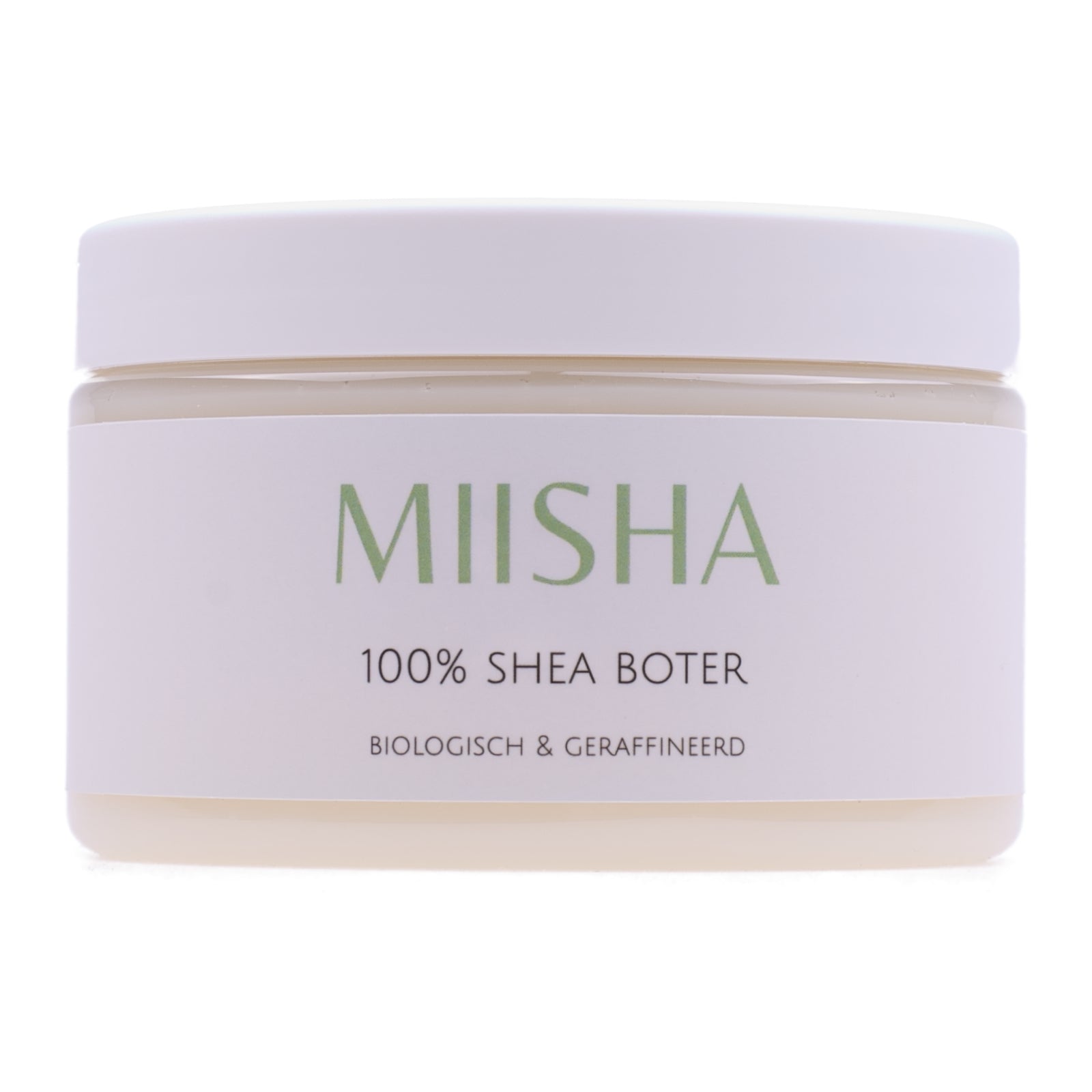 Shea boter is een natuurlijk vet onttrokken aan de noten van de shea boom, ook wel Karité boom genoemd, een typische Afrikaanse Savanneboom. Shea Butter bevat vetzuren zoals oliezuur, stearinezuur, linolzuur, linoleenzuur, beheenzuur, kaneelzuur en palmitinezuur. Het unieke vetzuurprofiel van shea butter geeft het een zeer verzachtende werking, speciaal voor een erg droge huid. Ze staat ook bekend om de positieve bijdrage aan de elasticiteit van de huid. Het is rijk aan vitamine F, bekend om de herstellende werking voor de huid. Ze stimuleert de cellulaire regeneratie en groei. Shea boter smelt bij een temperatuur van 31 graden Celcius waardoor het zeer makkelijk is op de huid te smeren en dringt snel in.