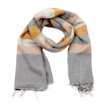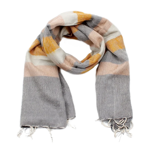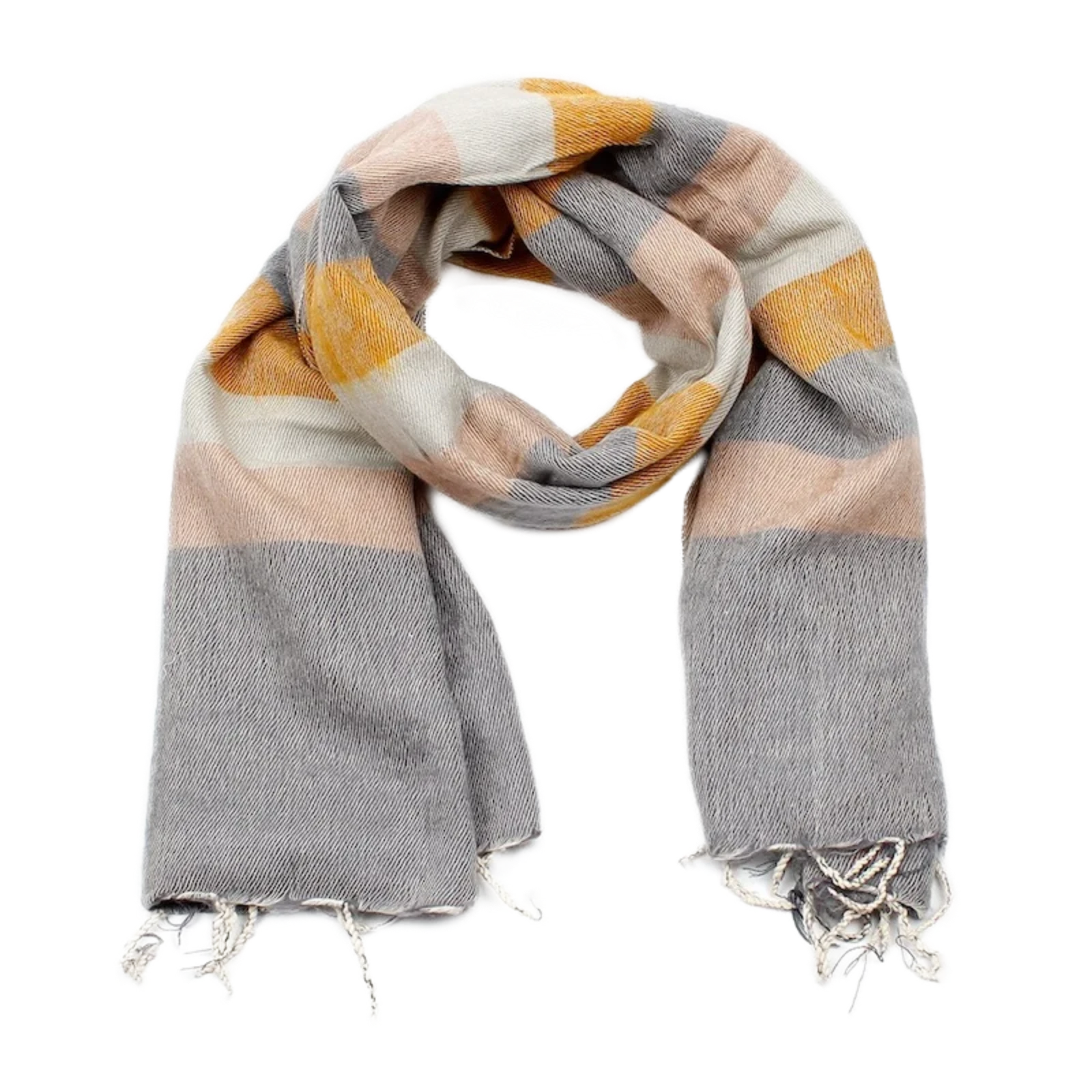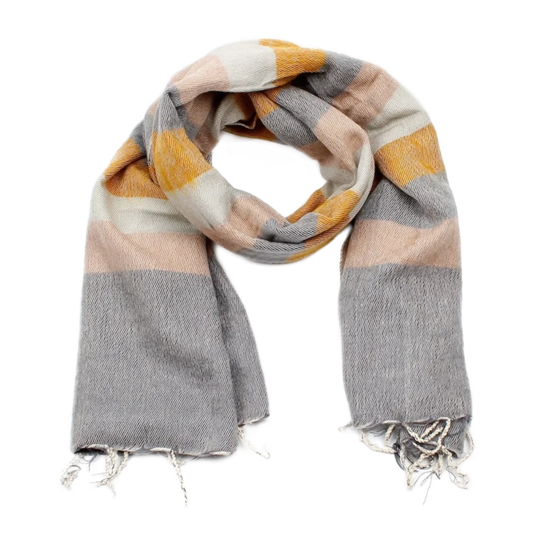 Heerlijke zachte sjaal in de kleuren okergeel en crème. Omdat de sjaal geborsteld is, voelt hij lekker zacht aan. In de winter te dragen als warme sjaal en in de zomer als omslagdoek.